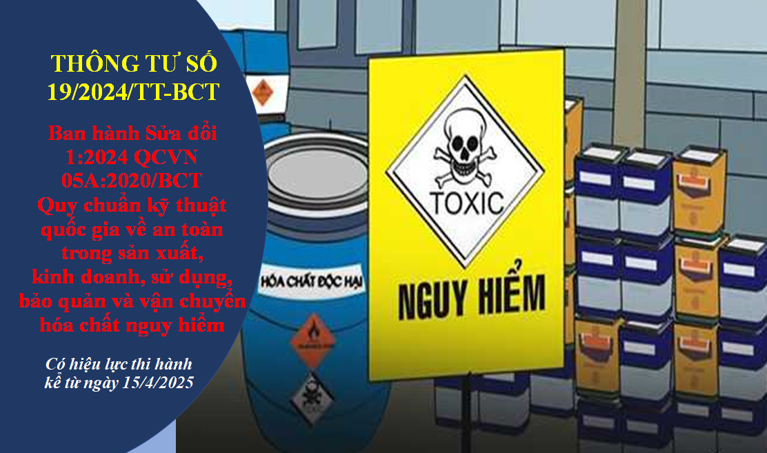 Ngày 10/10/2024, Bộ Công Thương đã ban hành Thông tư số 19/2024/TT-BCT ban hành sửa đổi 1:2024 QCVN 05A:2020/BCT Quy chuẩn kỹ thuật quốc gia về an toàn trong sản xuất, kinh doanh, sử dụng, bảo quản và vân chuyển hóa chất nguy hiểm.
