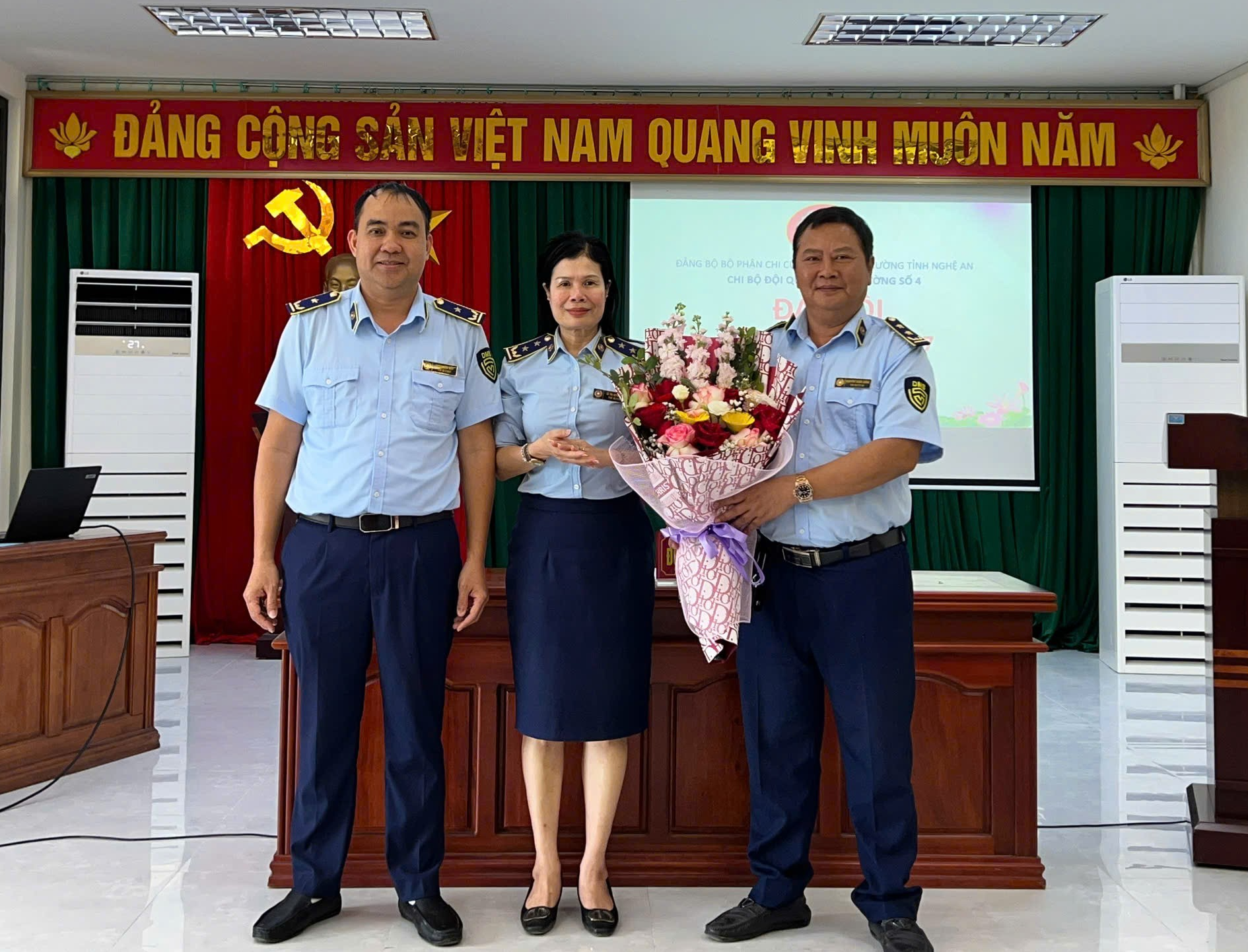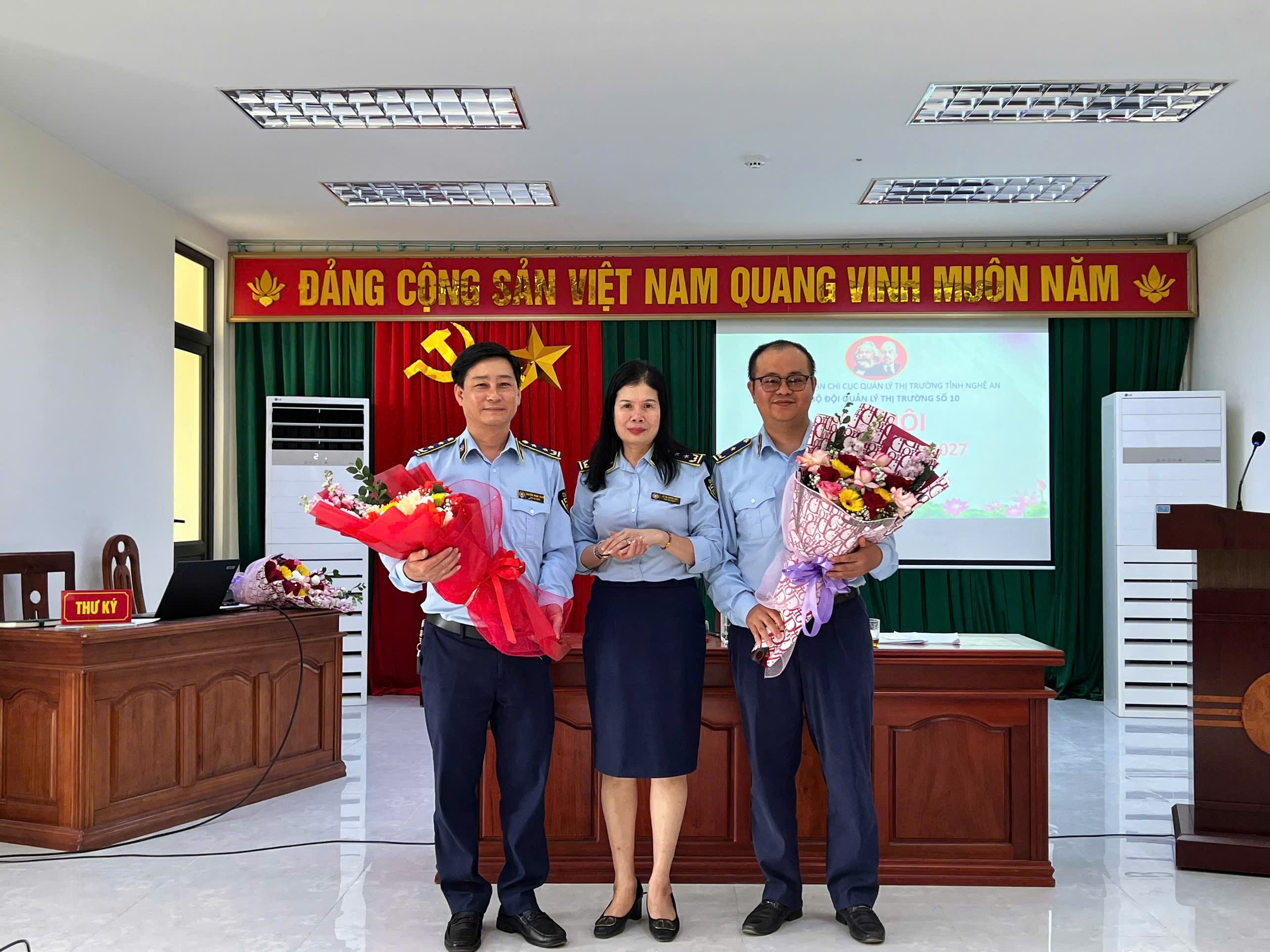 Đ/c Hoàng Văn Nhiên - Phó Bí thư Đảng ủy UBND tỉnh, đ/c Phan Bá Yên - Ủy viên BCH Đảng bộ Sở Công Thương, đ/c Nguyễn Văn Hường- Bí thư Đảng ủy Chi cục QLTT tặng hoa chúc mừng Chi ủy Đội QLTT số 3